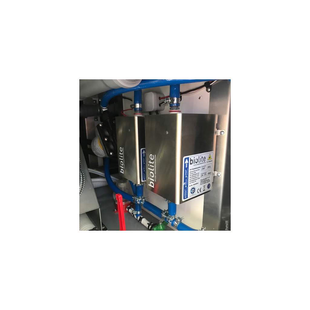 Das BIOLITE®-Wasserdesinfektionssystem eignet sich mit einer Durchflussleistung von bis zu 8 Liter/Minute ideal für die Trinkwasserdesinfektion von Reisemobilen, Expeditionsfahrzeugen, Yachten und Booten sowie Food-Trucks. Zur Erhöhung der Durchflussleistungen können zwei Einheiten parallel angeschlossen werden. Die Komponenten des Wasserdesinfektionssystems (UV-C-LED-Einheit, Vorschaltgerät, Steuergerät) sind einem hochwertigen Edelstahlgehäuse integriert. Die Einheit ist schnell installiert und kann auch einfach nachgerüstet werden.