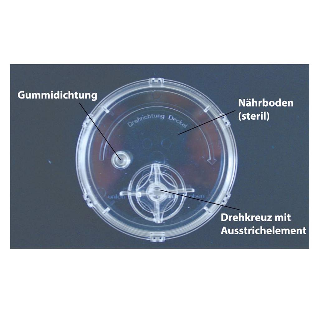 Die Petrischale hat einen sterilen Nährboden. Das integrierte Ausstrichsystem ist die Besonderheit dieser Petrischale. Über eine Dichtung wird die Wasserprobe in die geschlossene Petrischale eingespritzt. Das besondere Ausstrichsystem verteilt die Probe dann gleichmäßig auf der Oberfläche des Nährbodens, ohne die Petrischale dafür zu öffnen. Die gleichmäßige und sterile Probenverteilung garantiert genaue und unverfälschte Ergebnisse. Pro Probe wird nur eine Petrischale mit Nährboden benötigt. Der Test ist einfach und kann von jedermann selbst durchgeführt und ausgewertet werden.