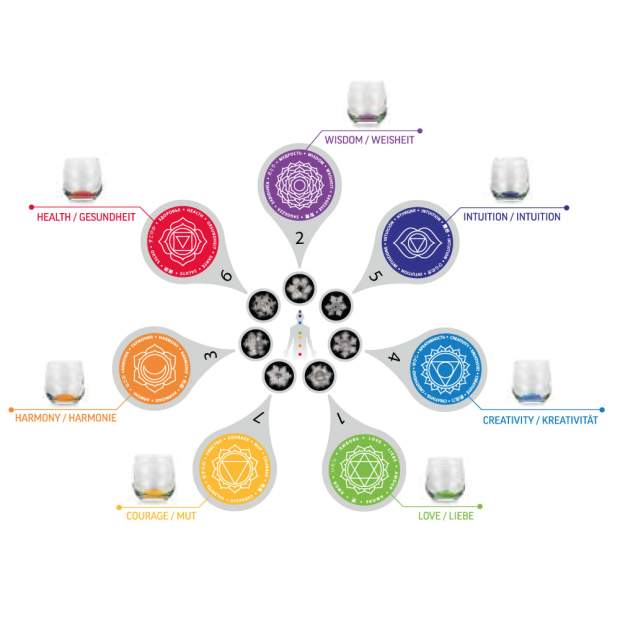 Die Formgebung nach dem Goldenen Schnitt sowie die speziell ausgewählten Farben, Symbole und Affirmationen können dazu beitragen, dass sich unsere Chakren durch das so informierte Trinkwasser wieder ins Gleichgewicht kommen. Die Chakren sind Energiezentren, welche sich auf einer Energiebahn in der Körpermitte befinden. Diese insgesamt 7 Chakren haben einen großen Einfluss auf die psychologische Verhaltensstruktur. Das hier angebotene Set besteht aus 7 Bechergläsern MYTHOS als einer Auswahl verschiedener Kombinationen von Chakren und Affirmationen: